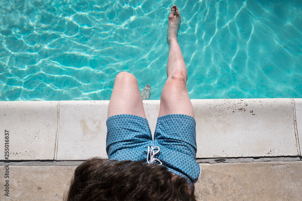 Foto Stock Looking down at man sitting on the edge of the pool Very well made.