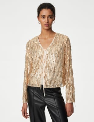 Sequin V Neck Tie Front Blouse M S ES Very well made.